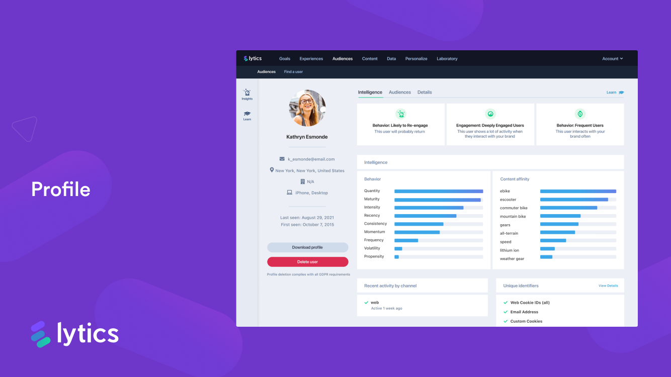 Harness the power of first-party data to understand what your customers really want with Lytics, the customer data platform built for marketers. Lytics decision engine uses machine learning to interpret your customers' needs and help marketers deliver timely, relevant communications across multiple channels. Define your goals and let Lytics’ AI identify the levers you can pull to accelerate results and deliver ROI. Engage new and current customers with personalized messages and precision targeted campaigns. Maximize your impact with predictive marketing strategies shaped by your customers’ actions, not your assumptions.
