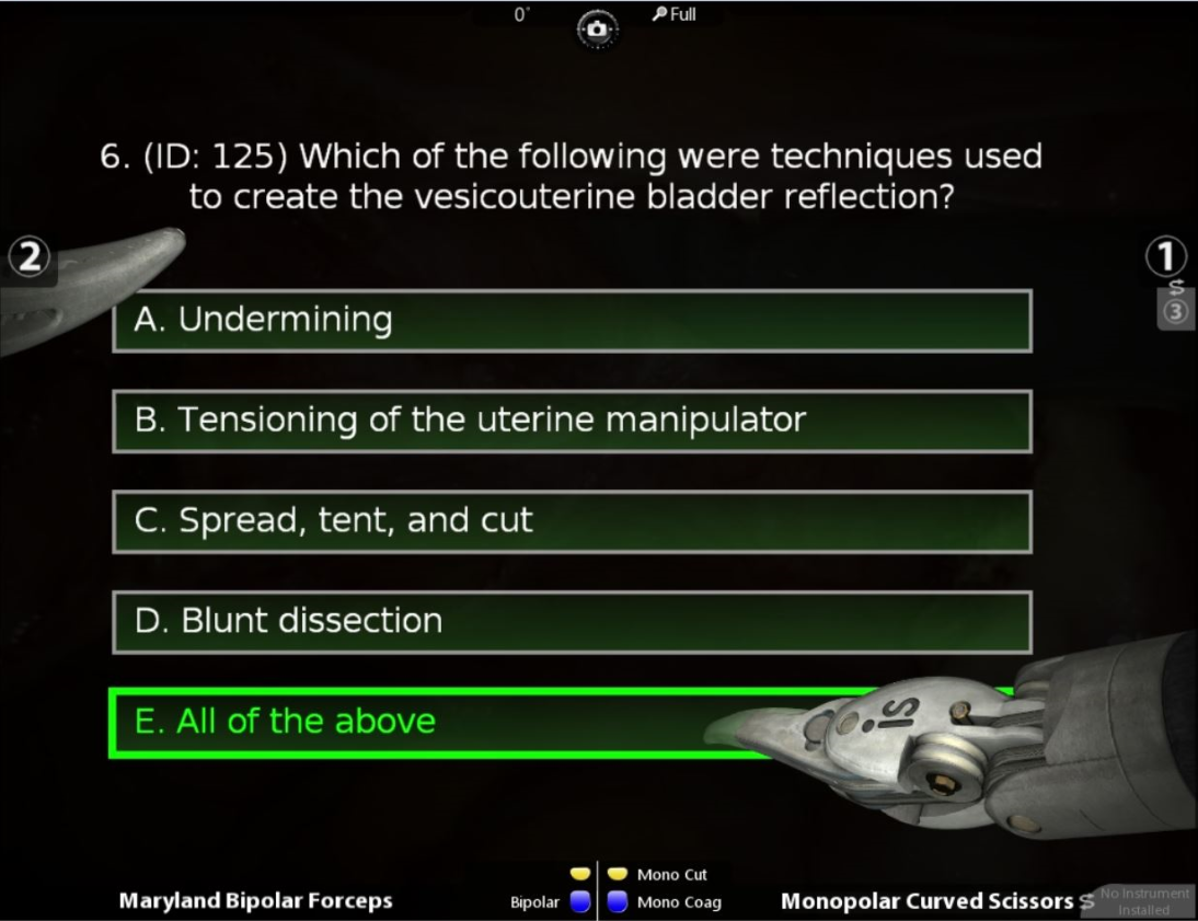MaestroAR® provides procedure-specific learning in 3D augmented reality on both dV-Trainer® and FlexVR™ robotic surgery simulators. Based on recorded surgical procedures, MaestroAR® allows trainees to immerse themselves in the surgery by using the simulator to control virtual robotic instruments to interact with anatomical regions within the augmented 3D video. Maestro AR® provides opportunities to gain procedural familiarity and to develop decision-making skills. Narrated by influential, globally-recognized robotic surgeon educators, the trainee is guided through a complete robot-assisted surgical procedure, step by step. The trainee manipulates virtual 3D robotic instruments in order to answer questions about the procedure, identify and interact with anatomical regions, and perform virtual reality skills exercises.