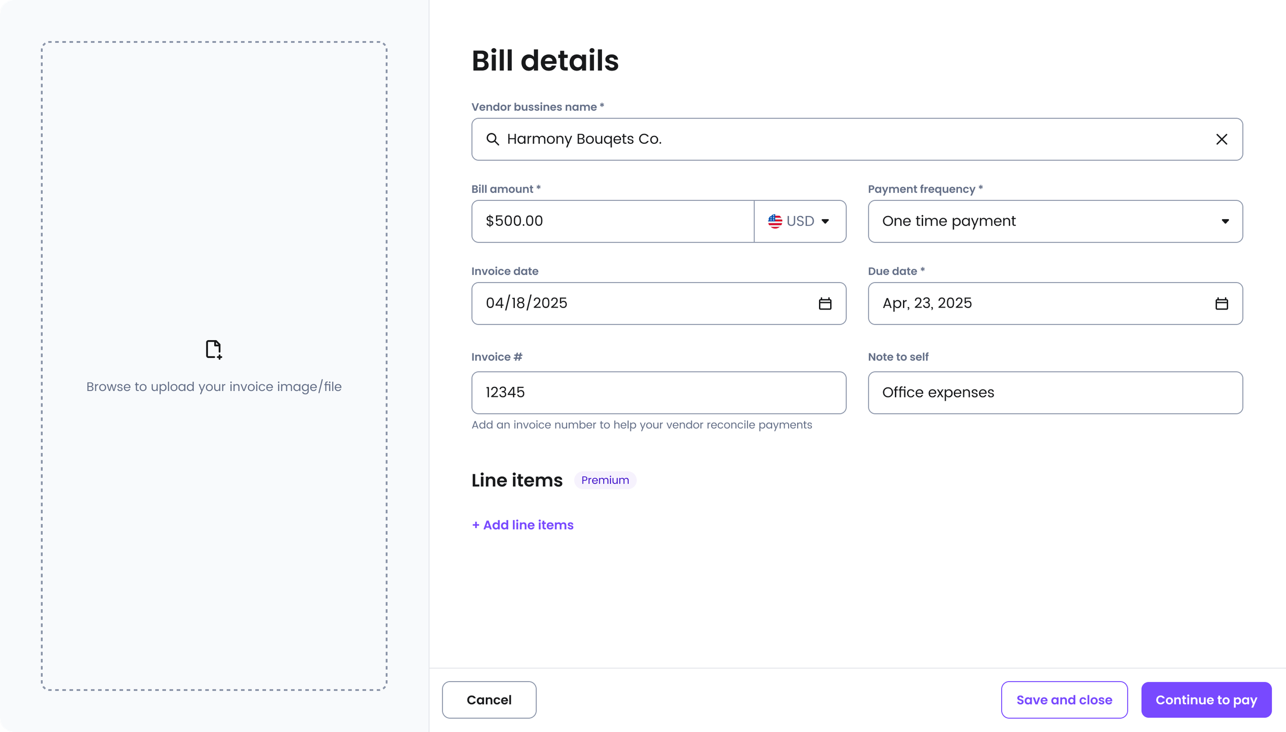 With Melio, pay by bank transfer or card to extend cash flow and earn rewards. Adding vendor or bill details is a breeze—input them manually, upload files, or take a photo of invoices. Schedule payments to align with your cash flow, and let Melio handle the rest. International vendor payments are made easy by paying in their local currency for products and services your business needs.