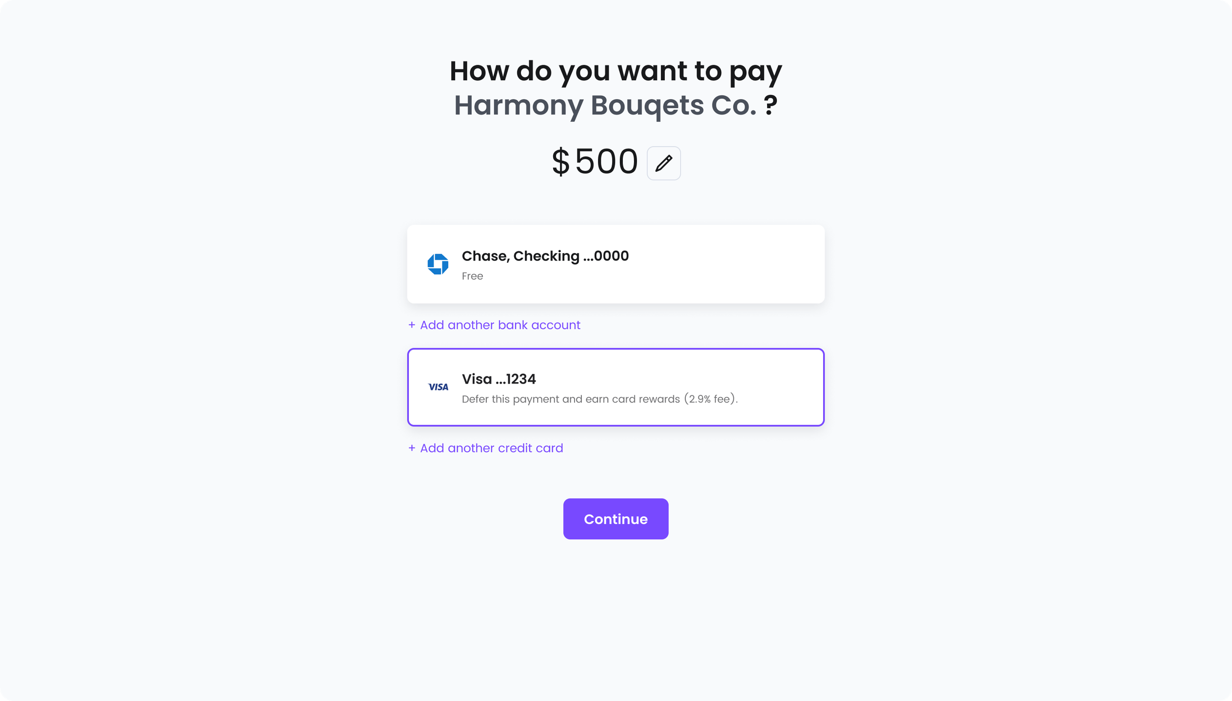 Choose from ACH transfers, card payments, international bank transfers, or send a check to your vendor.