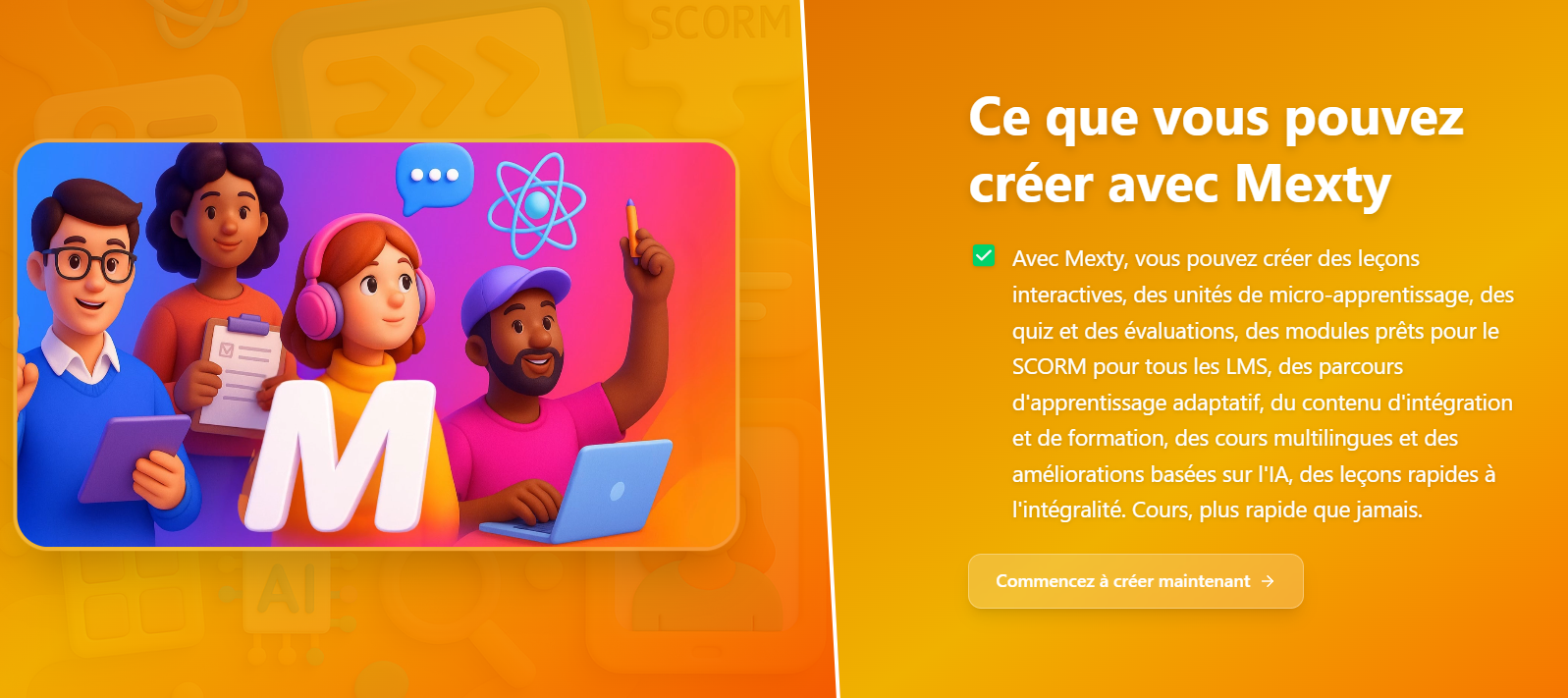 Mexty fits K–12, higher-education, and corporate L&D alike—whether building full courses, microlearning, or quick practice activities—and integrates seamlessly with platforms like Moodle, Canvas, Blackboard, TalentLMS, Docebo, and Cornerstone. It makes modern course creation fast