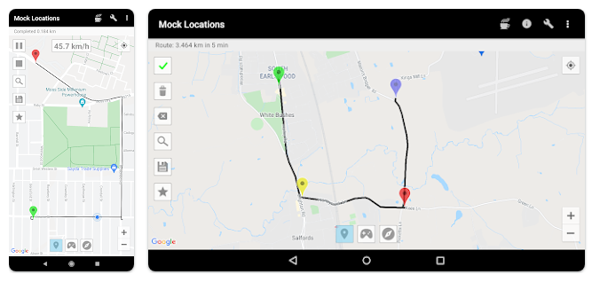Mock Locations allows you to fake information about the location of your phone by GPS and network operators. You simply navigate the route on the map to have all of the applications on your phone give fake information about the location. This will help in developing applications or if you want no one to know where you really are. Before purchasing the full version of the application check the performance on your device. For this purpose, there is a free trial period of 24 hours after installing the app. During this time, you can use the premium features. Emulation GPS location and according to the service provider. Ability to create a route on roads. Ability to set breakpoints and specify the stay in them. Ability to set a variable speed. Allows you to build a route for movement along a closed path. To do this, lay the route so that the start and end points were near. You can hide an application icon from the status bar.
