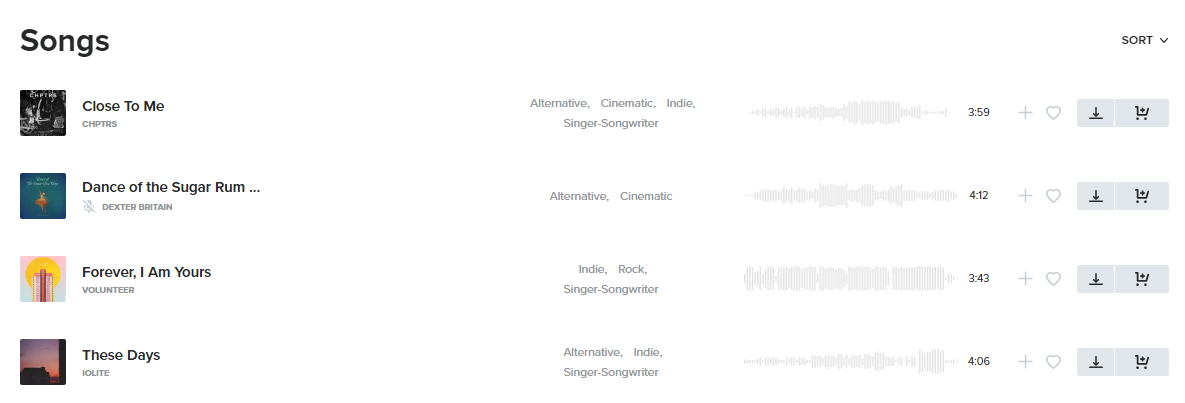 Discover a highly curated roster of label-quality musicians and composers. Our artists are tour-tested and on-the rise. They put as much heart into their projects as you do into yours, and it shows. Simplify your process with a subscription. When you are logged into your account, select the main menu located in the upper right-hand corner of the site and go to “Licenses”. There will be a download button next to the song. You can also follow the download link in your email order confirmation. You can edit the song to fit your project, as long as the overall intent and character of the track remains unchanged. Remixing or adding additional musical elements to a track for sync use requires permission from Musicbed. You can share a project you have created by going to the “My Projects” page listed under the menu on the home page, and selecting the share icon next to the project title.