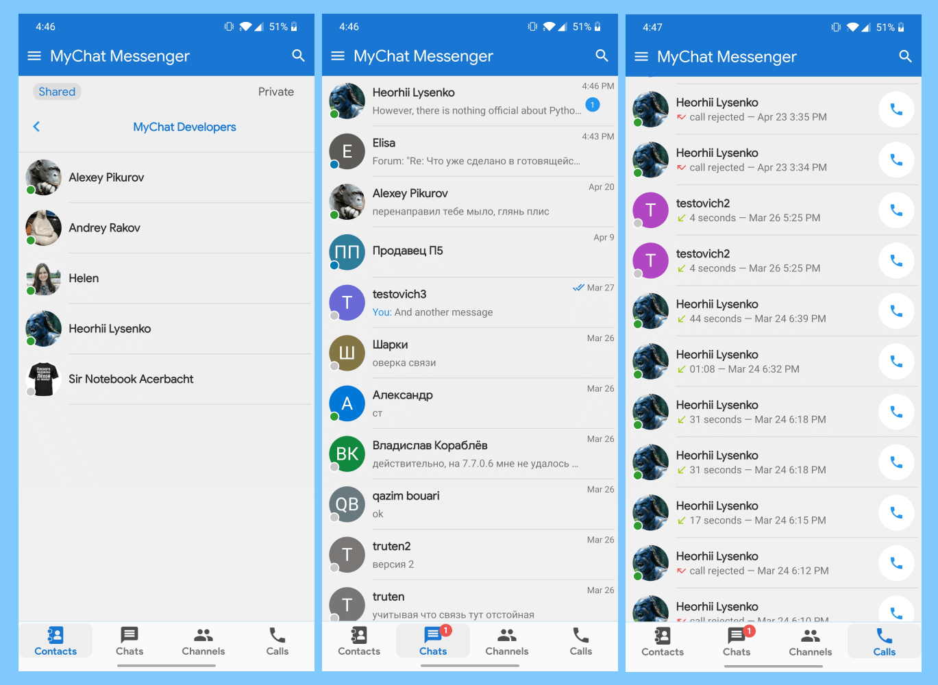 Built-in knowledge base, important notifications with return receipts, Bulletin board, broadcast messages, flexible server management, the system for user rights to access MyChat features, voice/video calls, screen sharing calls, Kanban project management, conferences, private dialogues, extended contact list, available for all platforms: Windows, macOS, Linux, Android, iOS, WEB.