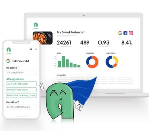 Create optimized ad campaigns on Google, Facebook, and Instagram all in one place with Nanos patented Artificial Intelligence technology. Sign up at Nanos and tell us in a few words about your great product or service. Nanos AI will suggest ad text, keywords, interests, and platforms for your ad. Decide on the budget you want to spend, and how long to run your ads. Log in to your dashboard and watch Nanos AI in action optimizing at lightning speed. Nanos is always evolving and adding new features to make digital advertising even easier and more successful. Draft a campaign with multiple ads and publish them on several platforms simultaneously, from one single dashboard. Nanos currently enables you to create campaigns for Google, Facebook, and Instagram. Single images, videos, or carousel ads. Pick the option that best fits your ad or test different ones. Nanos supports traffic campaigns for all of our supported platforms and conversion campaigns for Facebook.