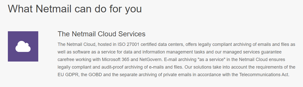 The main features of our business email archiving solution include lightning fast search and retrieval, ultimate scalability, and full compliance with GDPR, eDiscovery, Sarbanes–Oxley, HIPAA, and other legislation for e-discovery, retention and audit.