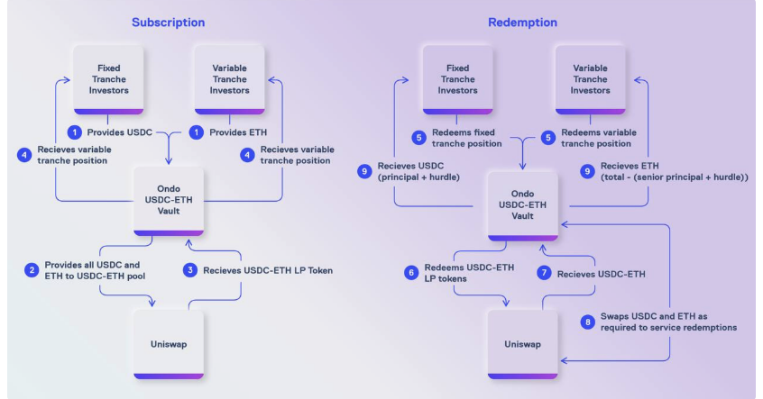 Ondo Finance makes decentralized finance available to anyone, providing users with a choice between downside protection and higher returns. Ondo splits pooled LP assets into multiple investment classes. Ondo Finance allows crypto-asset investors to trade the risk and reward balance of pooled assets. Existing yield in crypto-asset markets is in the form of volatile rates derived from a complex source of inputs. Ondo significantly broadens the investor base that can capitalize on these yields by establishing fixed yield positions with reduced risk and comprehensible exposure, while simultaneously providing new forms of leveraged exposure to experienced crypto-asset investors. In this implementation we restrict investors into two groups: fixed and variable yield positions. The fixed yield position will receive a fixed percentage over its initial investment. The variable tranche will receive all excess returns after the fixed yield receives its payout.
