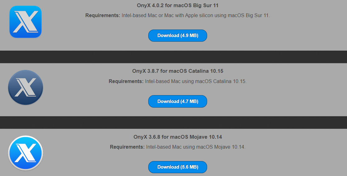 OnyX is a multifunction utility that you can use to verify the structure of the system files; run miscellaneous maintenance and cleaning tasks; configure parameters in the Finder, Dock, Safari, and some Apple applications; delete caches; remove certain problematic folders and files; rebuild various databases and indexes; and more. OnyX is a reliable application that provides a clean interface to many tasks that would otherwise require complex commands to be typed using a command-line interface. There is a specific version of OnyX for each major version of the operating system. Use the correct version, and don't try to use a version intended for an earlier operating system. Intel-based Mac or Mac with Apple silicon using macOS Monterey 12. PowerPC-based Mac using Mac OS X Jaguar 10.2 with BSD subsystem. OnyX only runs from an administrator account. The old applications are available, but they will be not updated anymore.