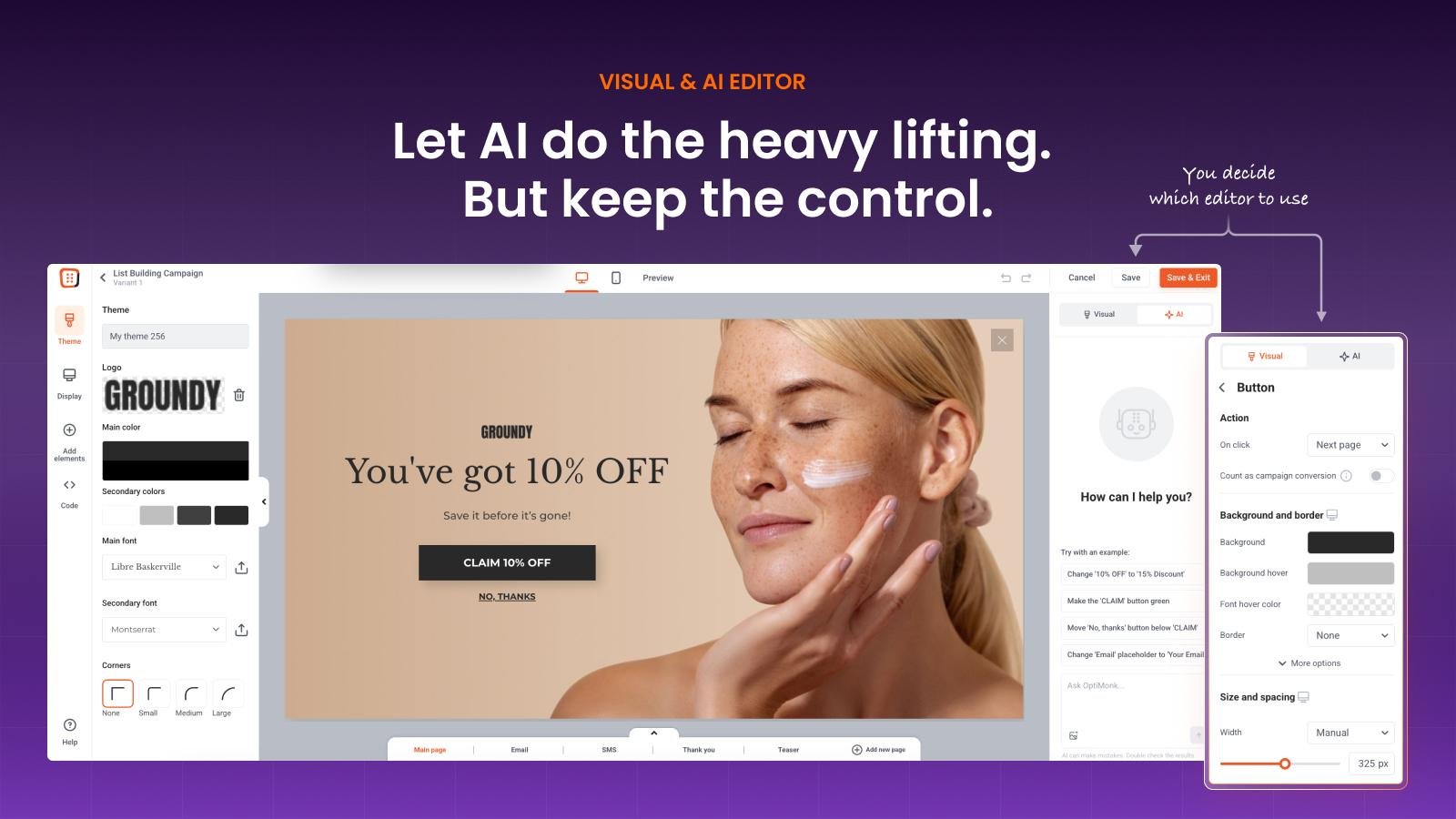 OptiMonk is the AI-driven popup builder designed for ecommerce businesses. It enables digital marketers to create high-converting popups in minutes, without any technical knowledge or complex editing tools. With just a few clicks, our AI creates popups that match your brand and are optimized for maximum conversion. And when you want full control, you can easily fine-tune everything using our drag-and-drop editor. Try OptiMonk and see the difference for yourself!