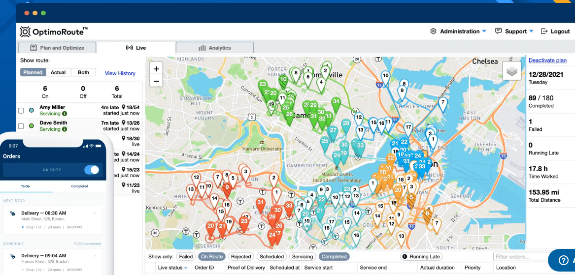 Easily import thousands of orders and instantly get the most efficient routes and schedules for your drivers. Account for all workflow constraints. Maximize the number of orders performed, while reducing costs. OptimoRoute™ calculates allowed working hours and driver costs to help eliminate overtime and reduce costs. Vehicle specifics put orders on the right truck (loading ramp, refrigeration) without overloading. Optimize for the best routes & schedules while respecting all order and task criteria: priority, time windows, day of week, date range, reverse logistics orders, variable job durations, skills matching and more. Remove the element of surprise. Know where your drivers are and view estimated time of arrival to each location based on the real-time information collected with the OptimoRoute™ mobile app. Send customizable SMS messages or emails to customers informing them when the driver is scheduled to arrive.