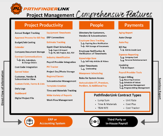 • Project and field management with RFIs, subcontracts, drawings, and change orders tied directly to the budget and schedule.