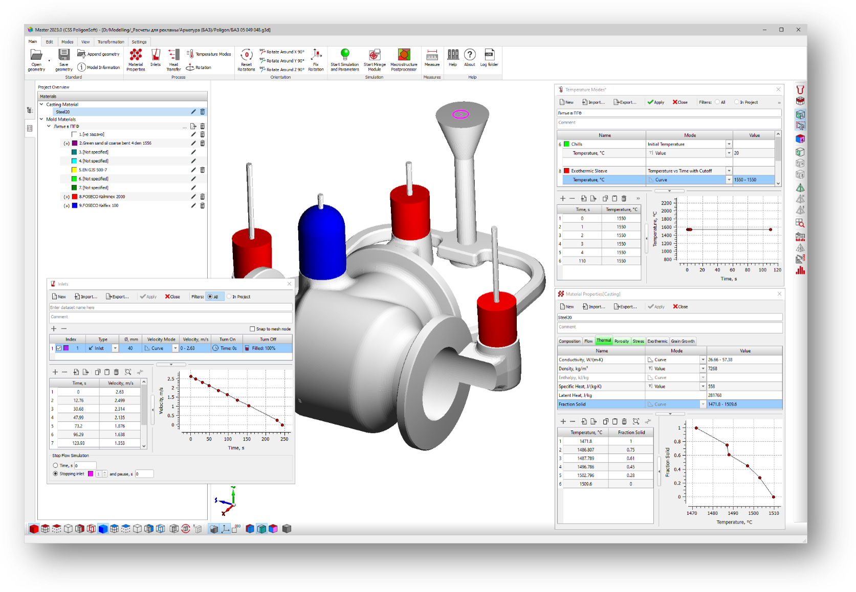 At PoligonSoft, all stages of the casting production process can be sequentially simulated: mold heating, mold filling with molten mass, solidification on the bench or in the thermostat, extraction of the cast part from the mold, cutting of the feeding system and risers, etc.