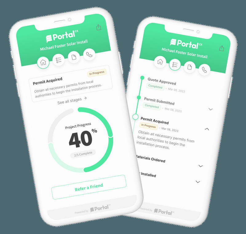 Informed customers are happy customers. PortalCX is an all-in-one experience platform, delivering a customizable portal to view their project progress and automated communications to give them peace of mind. PortalCX gives you and your customers a real-time view of projects in one easy-to-use app that also serves as a central hub for two-way communication, referrals, and promotions. Our intuitive app mirrors your progress and automates customer service tasks so you and your customers can keep track of any task, while two-way communication and email tools allow you to sync seamlessly. The best news? It all happens in one place. Poor communication causes stress and customer cancellations. Real-time project updates through PortalCX restores customer confidence and reduces churn and support costs by 20%. PortalCX keeps your customers up-to-date on project progress—while automatically prompting customer reviews and referrals.
