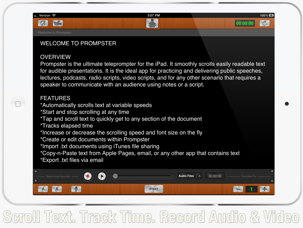 Eliminate cue cards, flash cards, paper notes and scripts forever. Mount your iPad on the tripod with your camera, tap start, scroll the text and never forget your lines again. Stay focused, keep your script at your fingertips and keep track of elapsed time. Practice and deliver speeches, lectures and sermons or use for any scenario that requires a speaker to communicate with an audience using notes or a script. Create or edit documents within Prompster™. Increase or decrease the scrolling speed and font size on the fly.