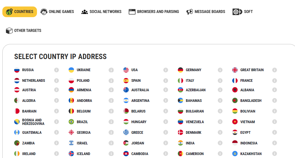 Cons: Wide selection of countries and cities, giving full flexibility for working with different regional platforms and location-specific services.