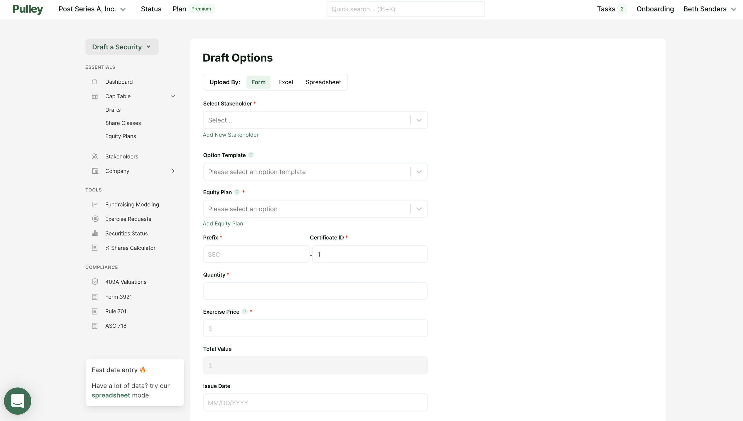 Pulley offers an easy-to-use platform that supports early-stage companies from incorporation. We have the customization available to grow with companies as they scale. Pulley automates 409A valuation, Form 3921 submissions, Rule 701 compliance, board approvals, and supports electronic issuance of stock certificates. We process complex equity events like stock splits and complex vesting events instantaneously.