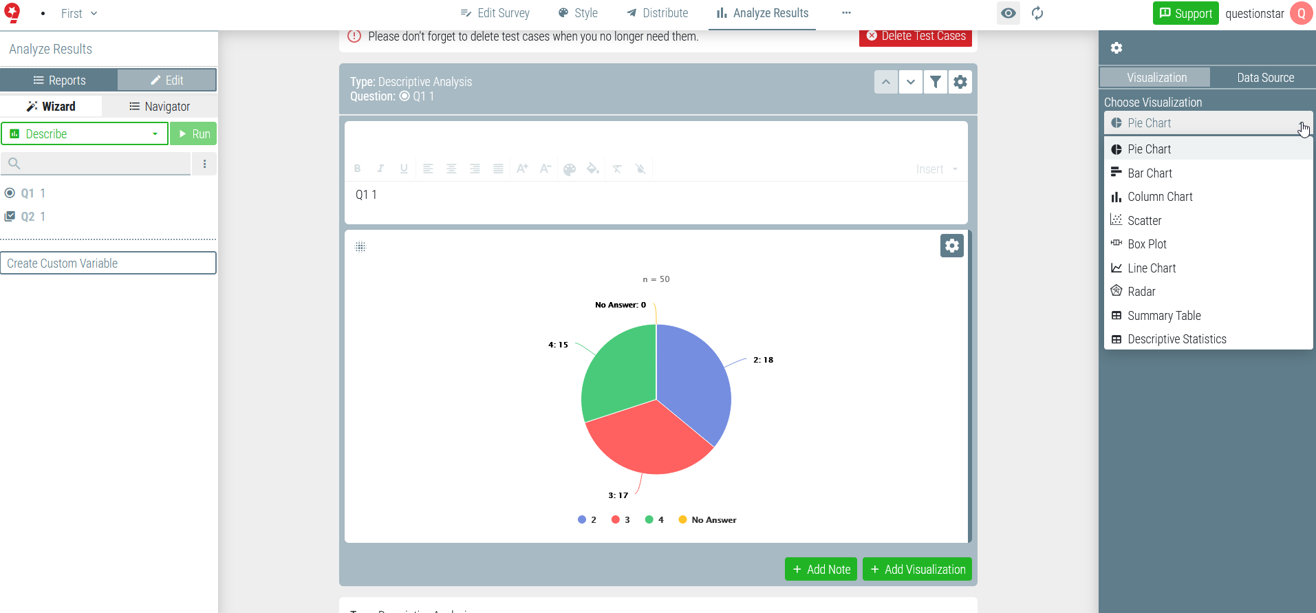 QUESTIONSTAR is one of the most powerful tools for online surveys. Extensive functions packed into a user-friendly interface make it easy to create professional surveys of any complexity level and to analyze and statistically analyze collected data online. Correlations, crosstabs, regression analysis, t-tests, etc. can be done online in the tool. Additional analysis software becomes obsolete with QUESTIONSTAR in most cases. All professional functions are available in all tariffs. Flexible customization of questionnaire and white-label surveys is possible on all paid plans. Results of analyses, tables and graphs can be exported and edited in MS Office. Free version available.