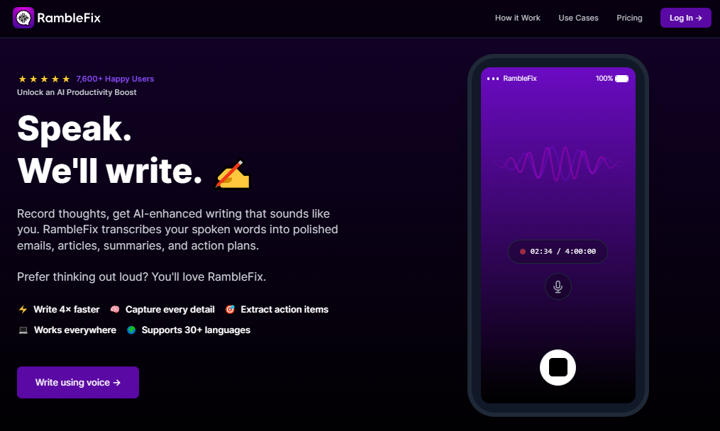 RambleFix is an AI-powered voice-to-text productivity tool that transforms spoken thoughts into polished, professional writing across a wide range of use cases. Users simply record in their browser or upload audio files, and RambleFix transcribes, cleans up grammar, rewrites for tone, and even mimics personal writing style to produce ready-to-use content. It supports over 30 languages and is designed for professionals who think best out loud, delivering outputs such as emails, meeting minutes, blog drafts, patient notes, interview transcripts, AI prompts, action plans, or social media posts. Its features include verbatim transcription, grammar correction, polished rewrites, one-click summaries, and automatic extraction of action items from spoken input. Real-time enhancements provide multiple tiers of refinement, from raw transcript to polished copy to tone-matched writing, allowing flexibility depending on context.