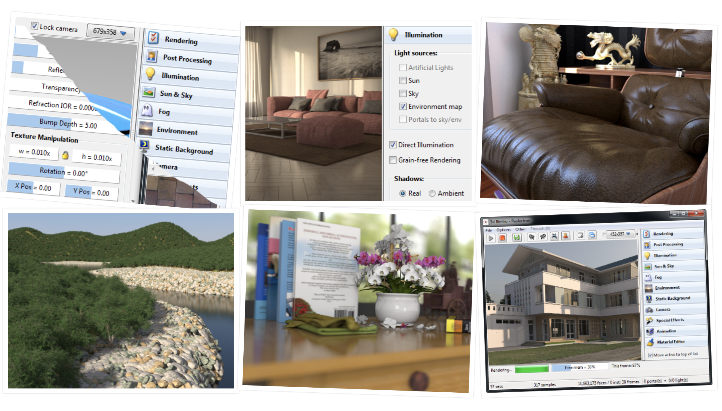 Raylectron took many years of research and testing. Creating such software is not an easy task. While Raytracing exist already for many years prior to Raylectron, they are not photorealistic. To achieve photorealism, tracing the light path to illuminate the objects in a scene requires the understanding of the law of physics, such as photons and how they interact with the surface of the object they hit. In real life, photons travel at the speed of light, hence everything is illuminated almost instantly (to our perception). But as a computer program, this can not be done so easily. First, speed is a big issue. Computers do not calculate anywhere near the speed of light. Furthermore, the mathematics involved is extremely complex. All of the features combined into one single software. Select from a wide range of illumination and a combination of them. Texturing your model has never been so easy, in real-time!