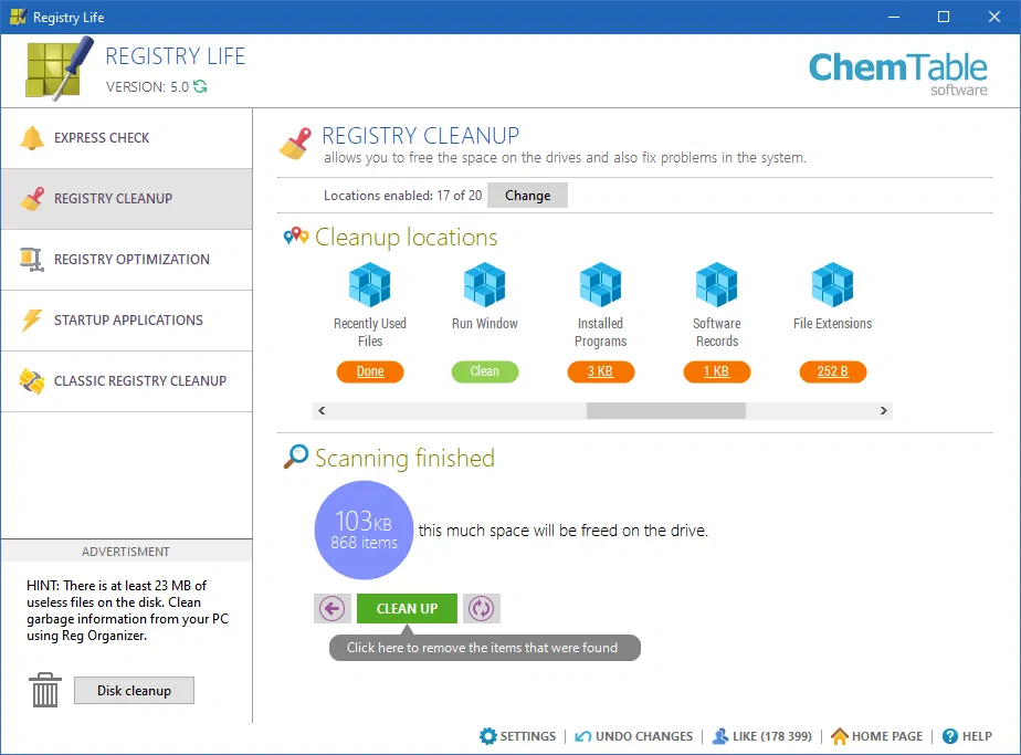 The system registry is one of the most important components of the operating system. The stability of the system's operation depends upon it being in working order, and the speed of the applications you work with depends upon the volume of data contained in it. Registry Life helps correct errors in the registry and optimizes it. It's a compact, simple to use, and free solution for servicing your system registry. Registry Life offers a handy tool to clean and repair the registry. With this tool, you can run checks on the registry to detect more than ten different kinds of problems. At the same time, this tool deletes informational junk from the registry. Registry Life is a utility to defragment and compress the registry. The program optimizes the registry quickly and efficiently and displays results of this operation visually.