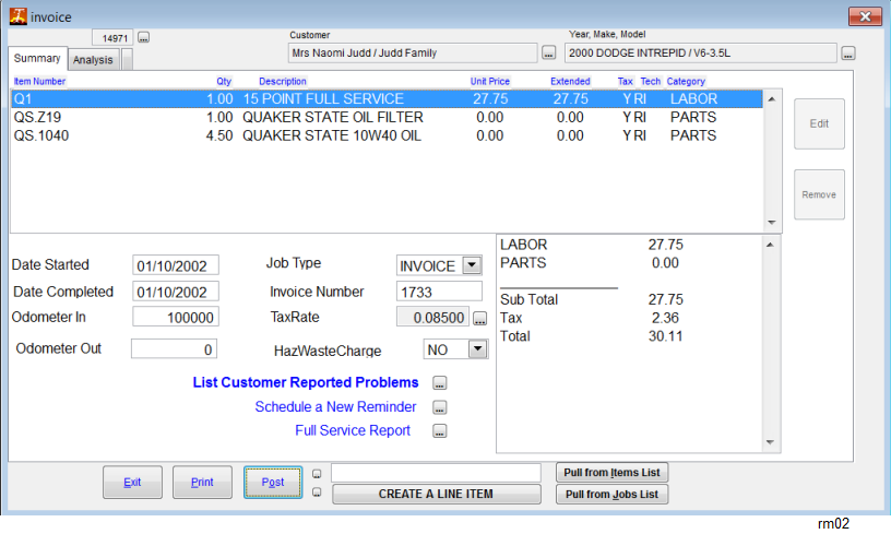 Unlimited space for the description of work when adding a line item to the invoice. Create canned items in the items file to help save typing. Print or email invoice or estimate. Professional-looking repair orders on plain paper. Service reminder system with postcards or flyers or email. Marketing section to help you get the word out to your customers. Scheduling vehicles for service.