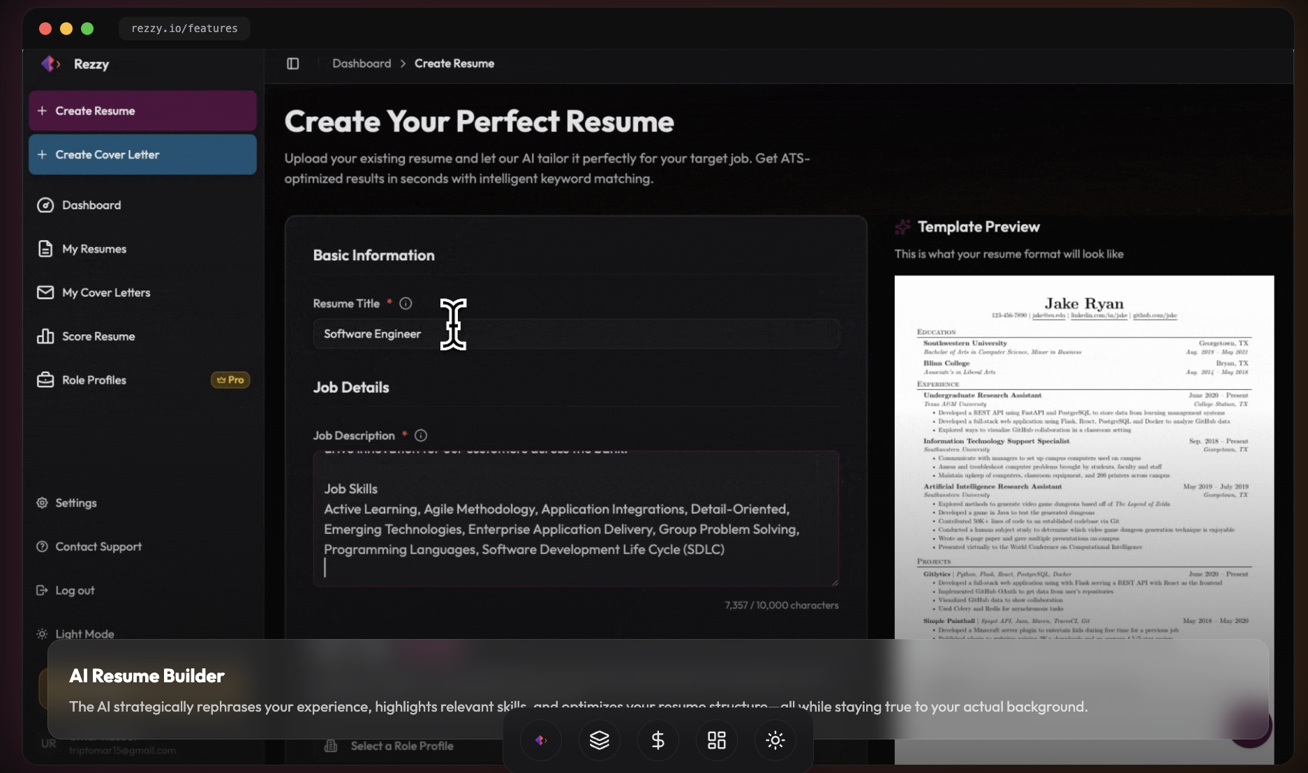 Rezzy is an AI-powered resume and cover letter platform that helps users get past ATS bots and into the hands of real recruiters by tailoring application documents to specific jobs using advanced intelligence trained on real job-winning resumes and recruiter insights. It includes an AI resume builder that rephrases experience, highlights relevant skills, and optimizes structure while staying true to your background, plus an AI cover letter generator that produces personalized letters aligned with your resume. It also offers role-specific targeting using models trained on successful resumes from specific companies, smart resume scoring to evaluate ATS compatibility, and built-in editors to refine content and formatting. Users upload their existing resume, and the AI analyzes it against a job description to develop a strategy and produce a professional, one-page, ATS-compatible document. Rezzy provides a dashboard to track documents, unlimited scoring, and editing tools.
