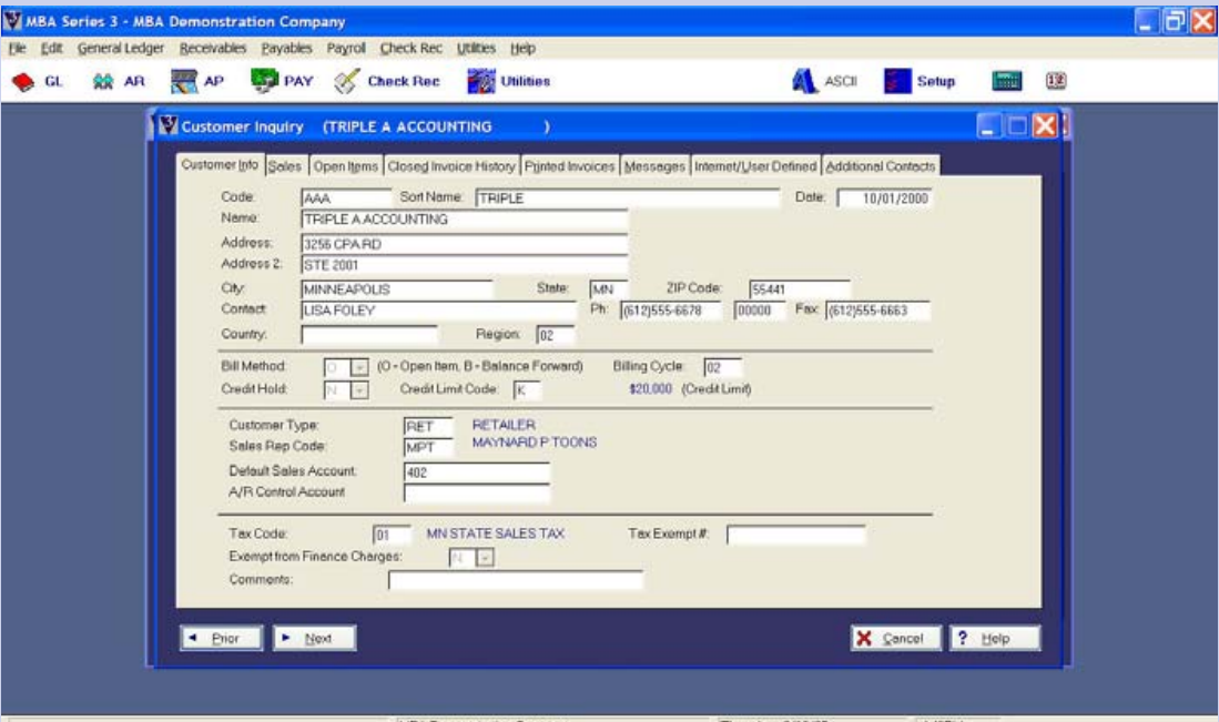 MBA’s SERIES 3 Accounts Receivable is a powerful cash and credit management system. It is designed to provide you with up-to-date information about one of your most important assets – your customers’ accounts receivable balances. You can easily produce invoices, credit memos, and debit or credit adjustments. Cash receipts and prepayments can be applied to specific invoices or to the oldest invoices first. Finance charges can be automatically calculated. User-defined aging periods can be set up for aging your customers’ balances. You can print Statements by billing cycle to ensure that your customers receive up-to-date information about their balances. Preliminary statements can also be printed or previewed prior to the actual production of statements. Collection letters that automatically list the amount past due can be printed for each customer.