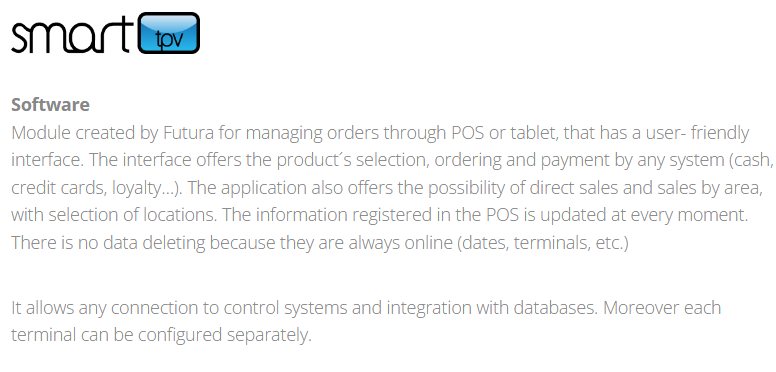 Module created by Futura for managing orders through POS or tablet, that has a user- friendly interface. The interface offers the product´s selection, ordering and payment by any system (cash, credit cards, loyalty…). The application also offers the possibility of direct sales and sales by area, with selection of locations. The information registered in the POS is updated at every moment. There is no data deleting because they are always online (dates, terminals, etc.). It allows any connection to control systems and integration with databases. Moreover each terminal can be configured separately. This module adds to Futura’s suite the ability to manage the renting of different items. You can request rented objects and display information about when and who has done the rental. Futura distributes several models of POS´s and tablets, run by Futura´s software. Besides, it is possible to integrate the software with the hardware that the customer provides us with.