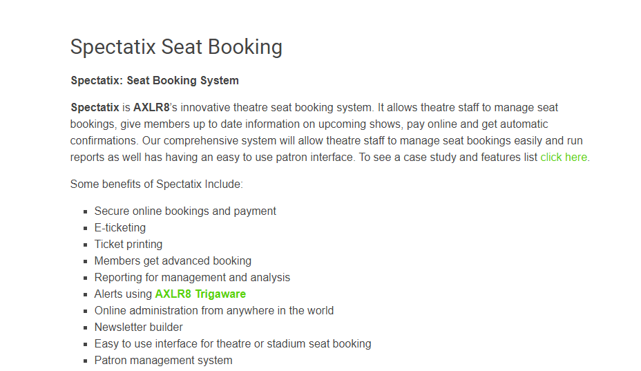 Spectatix gets you closer to the needs of your customers and prospects. It automates the processes in sales and customer handling so that you have more time to interact with your customers on a personal level. Spectatix will help you to increase sales by intelligent prospecting, one-to-one marketing, support and many other facilities that take advantage of modern information tools to communicate with your customers. AXLR8FastTrack provides helpdesk and support logging facilities to measure and improve existing customer satisfaction, responding to our clients needs.