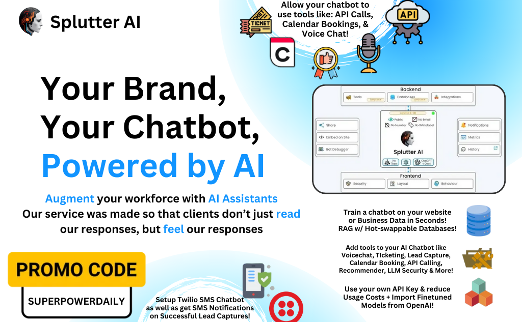 Struggling to keep your website visitors engaged? 🤔 Splutter AI lets you seamlessly add a fully customizable, AI-driven chatbot to your site—no coding required 🛠️. Tailor every aspect to match your brand, from layout to conversational flow! Trained on your website, with features like voice chat 🎤, automated bookings 📆, and lead capture 🧲, learn about your customers & increase conversion rates! Whether you are aiming to automate bookings, capture leads, or provide personalized recommendations 🎯, Splutter AI adapts to your needs, so why wait? Get Started Now! Ready to transform your website into an interactive experience? Use Promo Code SUPERPOWERDAILY for 30% Off Hobby & Business Plans. 🏷️