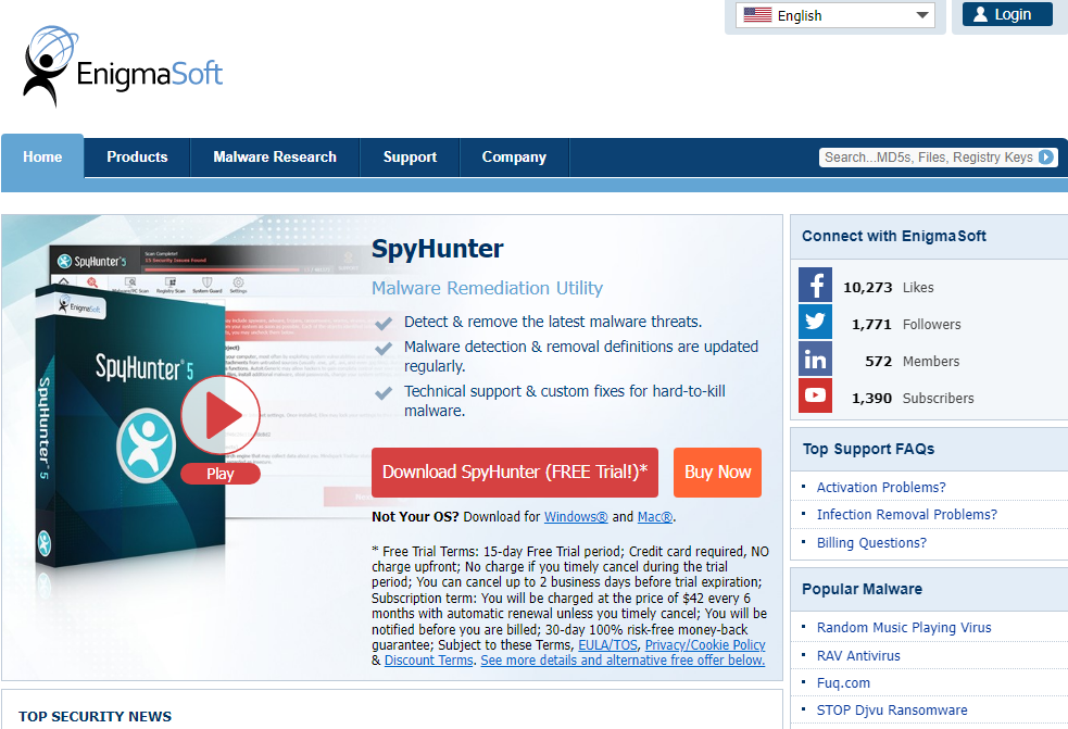 SpyHunter is an adaptive malware detection & removal tool that allows you to detect and remove the latest malware threats including spyware, trojans, rootkits, ransomware, keyloggers & other types of malicious software. SpyHunter's most advantageous features are its advanced remediation capabilities, its real-time system guards and its Spyware HelpDesk, which generates custom fixes to specific problems that may be unique to your PC. SpyHunter for Mac delivers powerful anti-malware tools to combat the increasingly prevalent & unique malware threats that infect Mac systems. SpyHunter for Mac offers optimization features to help users free up disk space and remove all traces of unnecessary apps. For persistent malware, our live technical support team is available to assist you.