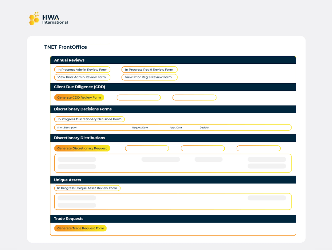 Robust wealth management CRM capabilities to manage and analyze customer interactions with the goal of improving business relationships with clients and COIs, assisting in client retention, and driving sales growth. Fully customizable trust and wealth management workflows covering the full life cycle of client operations. A suite of fully customizable workflows to simplify compliance and risk management execution. Full life-cycle wealth management workflows, from referrals to pipeline, fee exception approvals, sales management, account & client onboarding, custom incentive plans, and service tools to help you deliver value to clients.