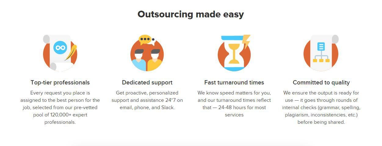 Ooutsource and scale fatser. Subscribe today and get unlimited access to everyday content and design services. Outsourcing has never been this easy and comfortable. Get unlimited access to all the major content and design services. Plus, all revisions are free! Every file created for the project belongs to you; ownership is transferred right after final approval. Every service workflow is split into a series of straightforward and repeatable steps that can be initiated in 3 clicks. Get proactive, personalized support and assistance 24*7 on email, phone, and Slack. Pay a subscription fee upfront and get all the work done. No additional fees. No hidden charges. We know speed matters for you, and our turnaround times reflect that — 3 days for most projects.