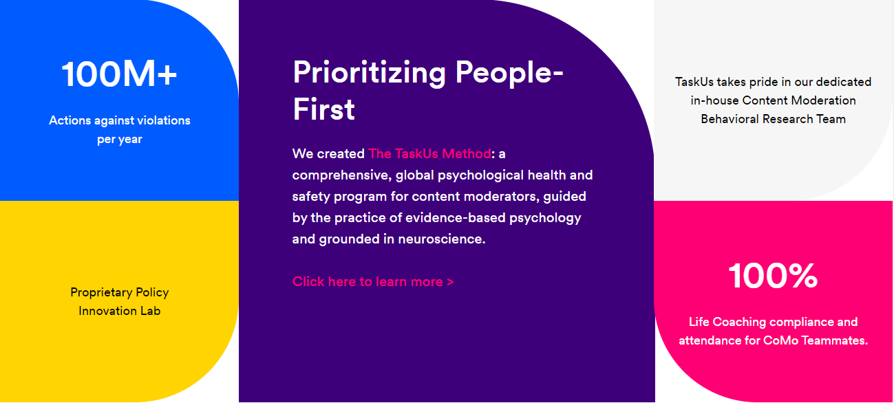 Safeguarding the online space with rigor and empathy. Online content is generated and shared at an exponential rate. With ever-present risks, companies need robust systems and vigilant human moderators to protect their users. Content security is a growing TaskUs service, and we are committed to creating the ideal online space. TaskUs is fully committed to becoming the industry’s number 1 content moderation provider and specialist – a goal that permeates every aspect of our services, our partnerships, and our unrelenting focus to keep the web safe for all. We created The TaskUs Method a comprehensive, global psychological health and safety program for content moderators, guided by the practice of evidence-based psychology and grounded in neuroscience. Content security is a fast-growing area of our business. We have 5,000+ dedicated Teammates powering some of the world’s leading brands in social media, FinTech, and gaming, among others.