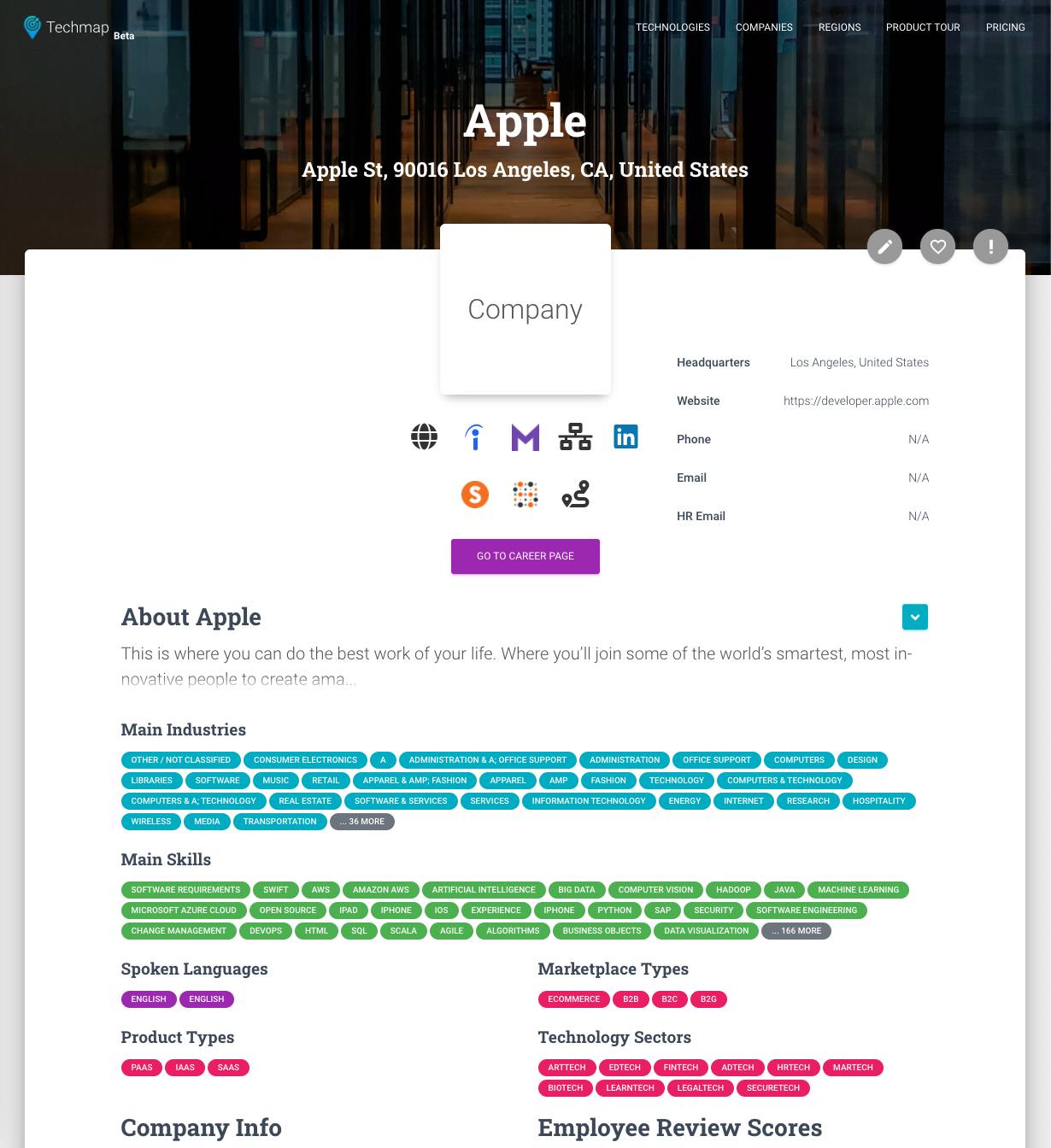 In addition to providing scraped data from job postings, including the job title, description, company, or location, we also offer additional identified information such as the industry, department, occupation, geo-coordinates, or timezone.