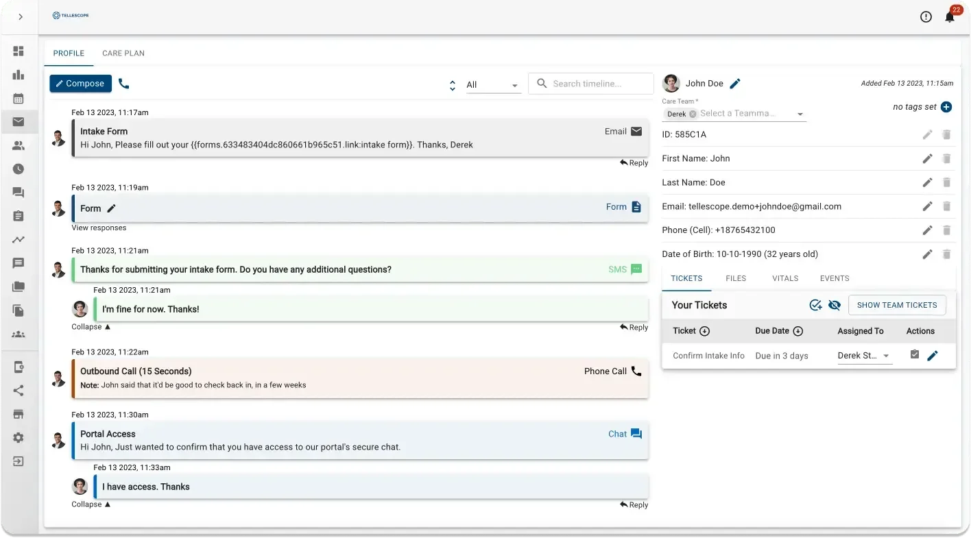 Tellescope is a HIPAA-compliant digital health platform that unifies patient relationship management, multi-channel communications, care coordination, and workflow automation into a single system designed for digital healthcare and virtual care organizations. It centralizes email, SMS, secure messaging, phone and video calls in a shared inbox, integrates with EHR systems and existing clinical tools, and delivers branded, mobile-friendly patient portals with self-scheduling, forms, reminders, education, and surveys to streamline the full patient journey from outreach and intake to ongoing care. Tellescope enables creation of automated workflows for reminders, task assignment, and data collection, reducing manual work and increasing team productivity while providing outcome tracking, custom reports, roles and permissions management, and internal collaboration features. Developers can extend and integrate Tellescope through APIs, SDKs, React components, and over 20 native integrations.