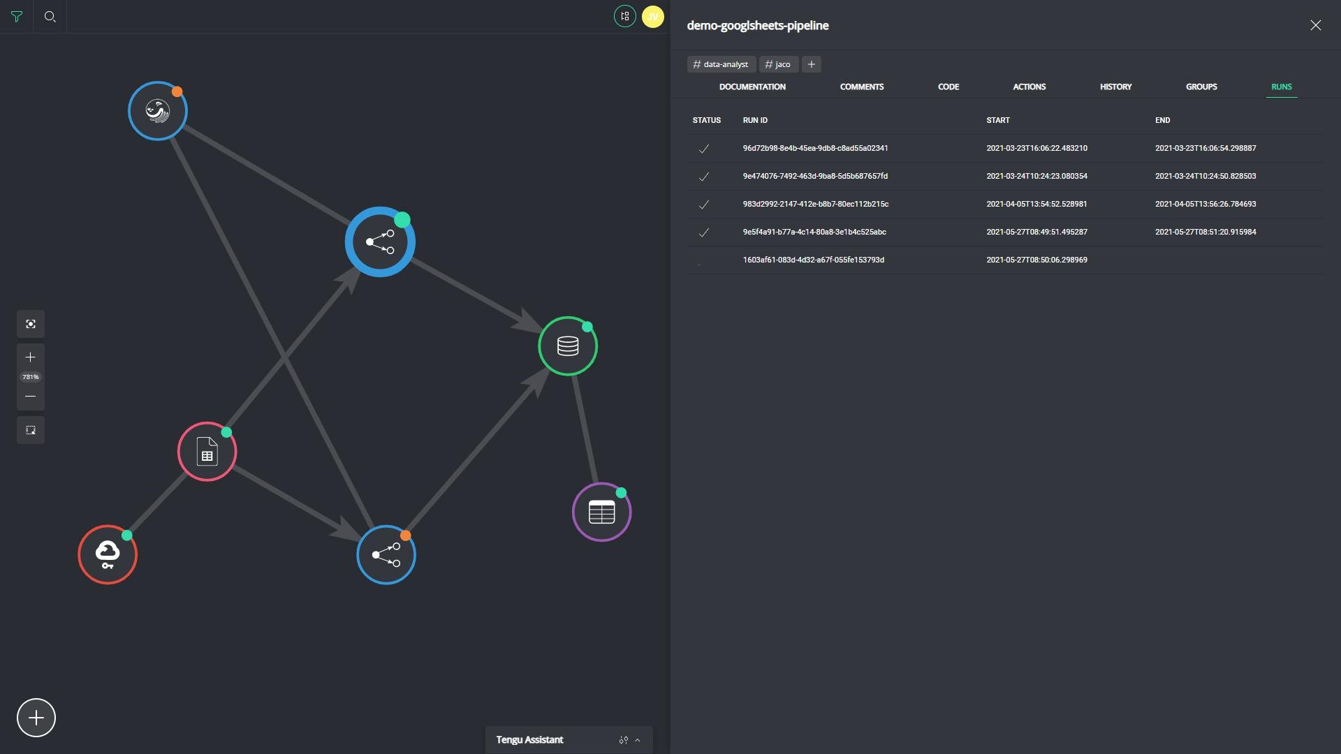 TENGU is a DataOps Orchestration Platform that works as a central workspace for data profiles of all levels. It provides data integration, extraction, transformation, loading all within it’s graph view UI in which you can intuitively monitor your data environment.