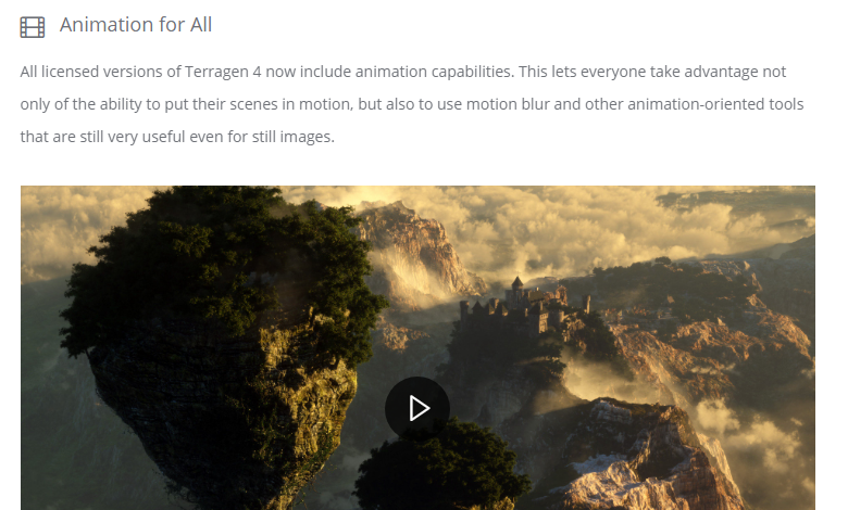Terragen 4 is faster, more interactive and easier to use. We’ve raised the bar of photorealism, while giving you new tools to create and explore your scenes more quickly and intuitively than ever before. The new Ray-Traced Preview (RTP) will revolutionize the way you use Terragen. It provides almost instant feedback as you work on your objects, shaders, atmosphere and lighting, allowing you to fine-tune your scenes much more quickly and easily. We’ve added simulation of the absorption of light by ozone in the atmosphere, making the already realistic atmosphere model practically indistinguishable from reality. Rendering engine enhancements allow Terragen 4 to render scenes which feature objects on average more than twice as fast as Terragen 3, and in some cases much more. The addition of high quality, context-aware lens effects such as bloom and starbursts bring an additional layer of photo realism, and all effects respond realistically to the characteristics of your light sources, etc.