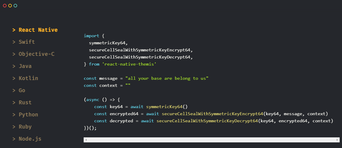 Secure Cell is a multi-mode cryptographic container suitable for storing anything from encrypted files to database records. Use Secure Cell to encrypt data at rest. Secure Cell is built around AES-256-GCM, AES-256-CTR. Secure Message is a simple encrypted messaging solution for the widest scope of applications. Use Secure Message to send encrypted and signed data from one user to another, from client to server, to prevent MITM attacks and avoid single secret leakage. Based on ECC + ECDSA / RSA + PSS + PKCS#7. Zero-knowledge proof-based protocol to compare secrets over non-trusted channels without risking leaks or reuse attacks. Use Secure Comparator for authenticating the users in a way that no password (or password hash) is sent over the network. Secure Session is a session-oriented encrypted data exchange with forward secrecy for better security guarantees and more demanding infrastructures.
