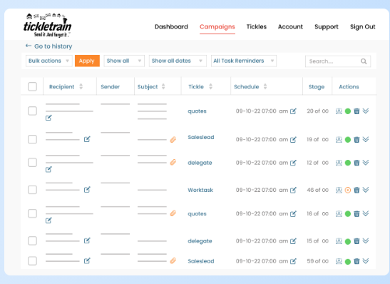 Never worry about staying on top of your to-do list again! Get your to-do list out of your brain and into TickleTrain. Gain peace of mind by easily turning your emails into tasks and effortlessly staying on top of your to-do list without leaving your inbox. Collaborate on tasks with people on your team and stop stressing about delegated tasks falling through the cracks. TickleTrain keeps track of them for you. Never forget to follow up with your leads. Let TickleTrain follow up for you with your personalized, pre-written emails. Set-up drip email sequences in a matter of minutes and deliver a polished appearance by using our built-in email templates. It follows up on emails for you when you don't get a reply; providing peace of mind every time you click send. It can convert an email into a task reminder with one click. It can also drip emails to any contact with different email content on a schedule you determine.