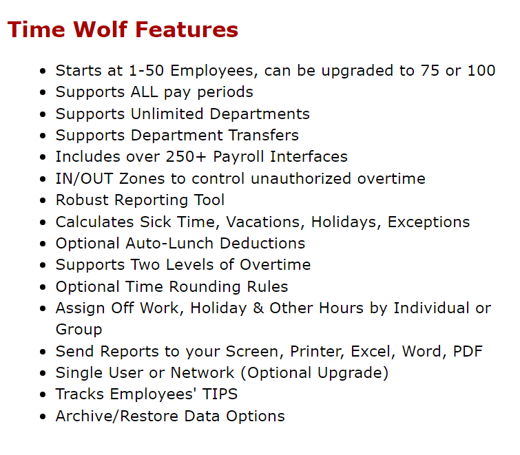 Lone Wolf Software, Inc. is proud to introduce Time Wolf 4.0 for small businesses. Lone Wolf Software Inc. has been providing Time & Attendance solutions to small business since 1991 with over 30,000 installs to date and growing. For the past 20 years Time Wolf Time & Attendance software has been recognized as the number one solution for small businesses. The Time Wolf solution provides you with a robust, easy to use application for collecting data for payroll purposes. Built into the solution are over 200 Payroll interfaces such as SurePayroll, QuickBooks, ADP Payroll and Paychex. Time Wolf solution can be deployed in any environment from a small office to a manufacturing facility the system allows you to only activate the functionality you need. There is No Risk with the Time Wolf solution as we offer a 30 Day Money Back Guarantee with your purchase, in addition you receive free support for the first 30 days.