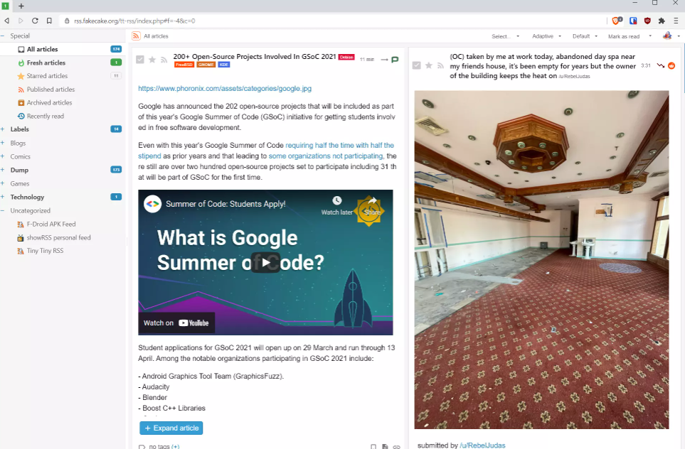 Tiny Tiny RSS is a free and open source web-based news feed (RSS/Atom) reader and aggregator. Free software, licensed under GNU GPLv3; self-hosted: control your own data and protect your privacy instead of relying on third-party services. Supports feed aggregation/syndication, keyboard shortcuts, and OPML import/export. Multiple ways to share stuff: export RSS feeds, plugins for various social sites, sharing by URL, etc. Sharing arbitrary content through tt-RSS. Plugins and themes, embedding full article content via readability and site-specific plugins, deduplication, including perceptual hashing for images, podcasts, flexible article filtering, JSON API, etc.
