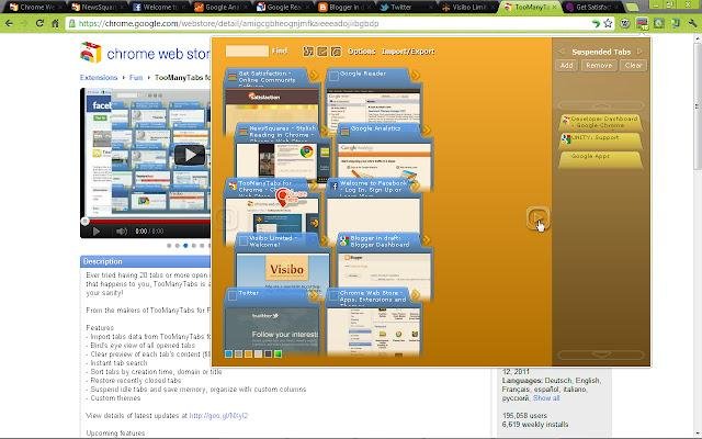 Ever tried having 20 tabs or more open in Chrome? You can’t even see the favicon of the tabs, not to mention the tab titles. If that happens to you, TooManyTabs is a must-have extension that manages your tabs, reduces your tab overflow, and saves your sanity. Suspend idle tabs and save memory, organize with custom columns. Remember recently closed tabs (within TMT). With TMT you're going to have a clear preview of each tab's content (fills up gradually as you use), be able to sort tabs by creation time, domain or title, and suspend idle tabs and save memory, organize with custom columns.