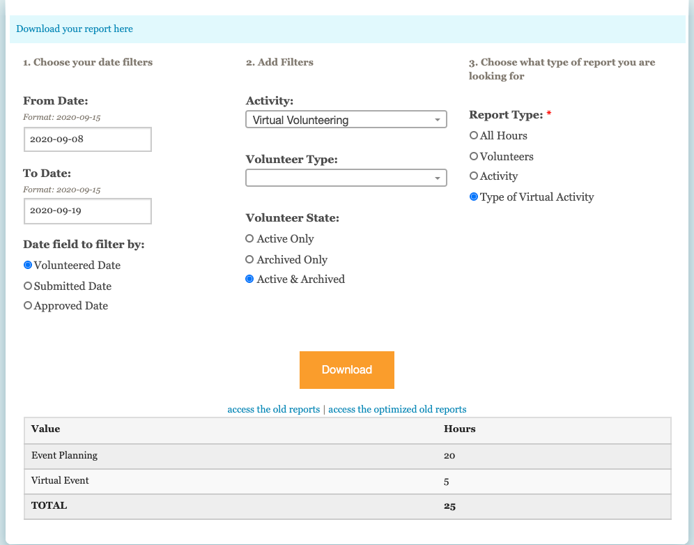 Volunteers can have access to their own dashboard to view and export their hours, how much of their goal they've achieved, and sign up for events.