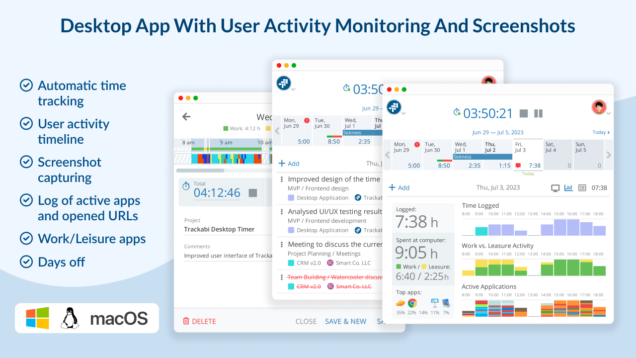 The key features of Trackabi are: desktop timer application for Windows, Linux, and macOS (screenshot capturing, user activity monitoring, log of opened apps); mobile application with GPS tracking; gamification of time tracking; customizable timesheets; employee leave management integrated with timesheets; customizable time reports; invoicing & payments; project plans & estimates; user access roles; client access; Git commits import; informative dashboards; company data insights; timesheets locking.