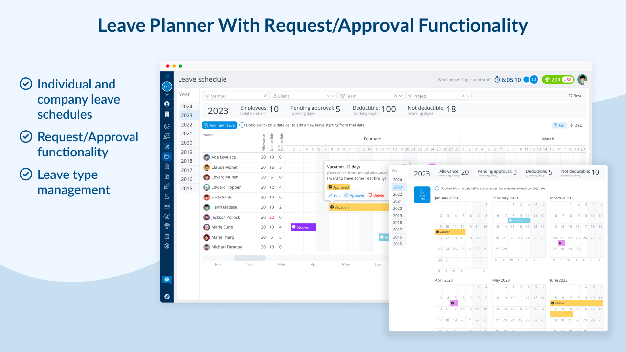 Pros: The desktop timer with activity monitoring and computer usage statistics; employee leave management with request and approval process.