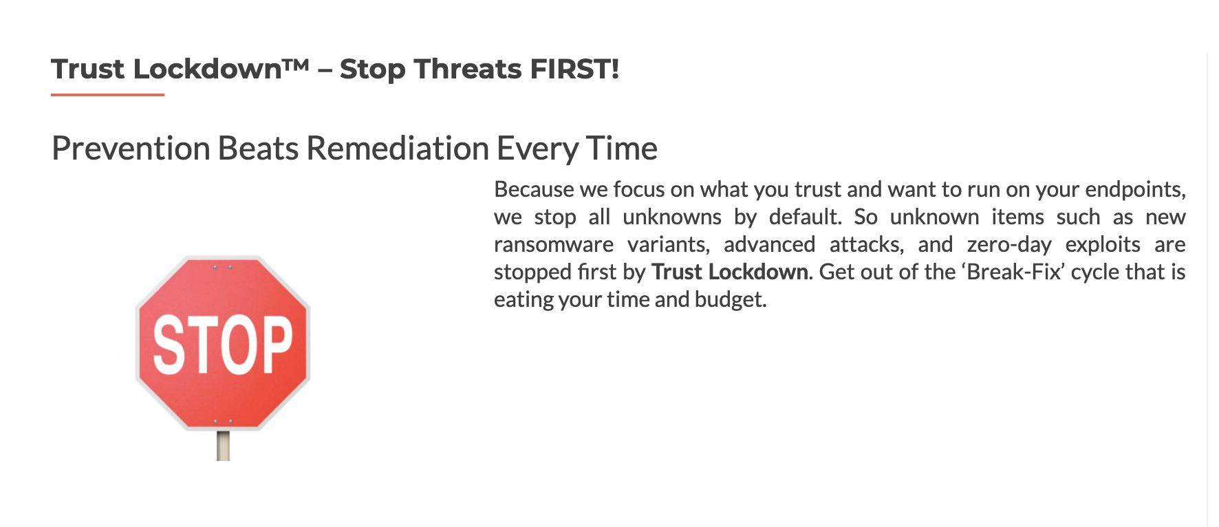 Because we focus on what you trust and want to run on your endpoints, we stop all unknowns by default. So unknown items such as new ransomware variants, advanced attacks, and zero-day exploits are stopped first by Trust Lockdown. Get out of the ‘Break-Fix’ cycle that is eating your time and budget. We also eliminate the need to be patching your apps every day. With Trust Lockdown, you can do your application patches on a regular planned basis instead of urgent need basis, again giving you back your time and budget to be more productive. Our protection also works when your device is offline! Whether you choose our cloud or appliance based service, our endpoint protection delivers the same protection when offline or disconnected from the network. An essential feature in today’s on-the-go environment and use of portable devices.