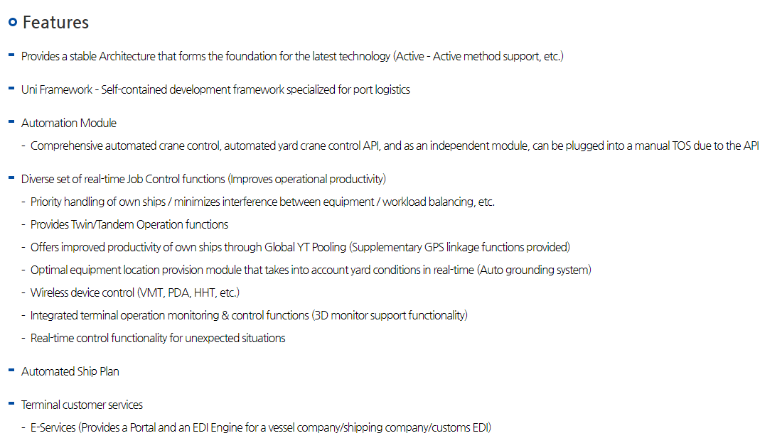 U& Terminal Container is a Terminal Operating System developed by combining the terminal operations know-how of the global maritime shipping company Hyundai Merchant Marine with the state of the art IT technology of HYUNDAI MOVEX, and as such, it is the solution with the largest market share among terminal operating systems in the domestic market. U& Terminal Container is an operating system optimized for both manual and automated terminal environments, and also supports specialized automation modules for manual terminals looking to switch to automation. The current 3rd generation of the U& Terminal is characterized by its outstanding operating efficiency founded upon an elegant operation planning algorithm; optimized resource utilization occurs through an automated planning system and yard management functions.