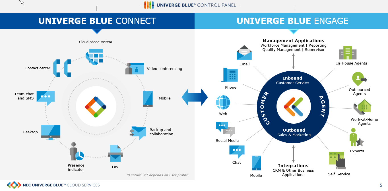 NEC UNIVERGE BLUE is a comprehensive Cloud Communications platform delivering leading-edge Messaging, Voice, Video, File Sharing, Chat, Contact Center, and Integrations all-in-one user-friendly platform.