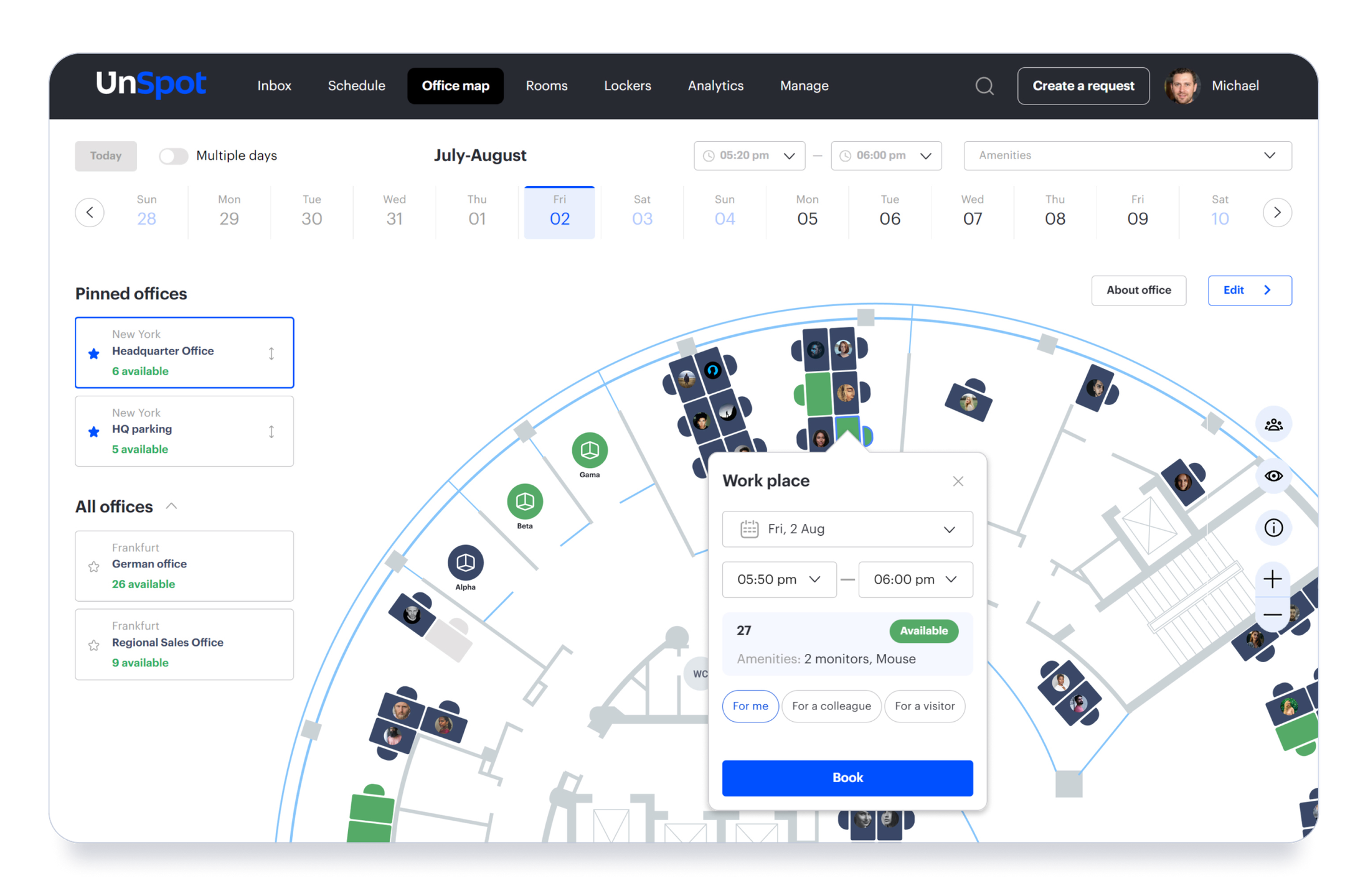 Overall: With three distinct office locations, UnSpot facilitates the management of desk reservations across all venues. Given that certain desks are configured differently, it is advantageous to have a transparent overview of what is accessible prior to arriving.